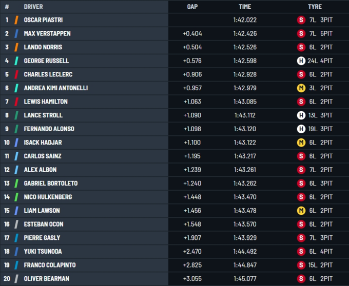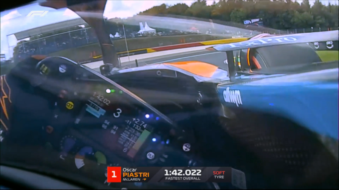 Долгое время лучшим был Шарль Леклер, однако Пиастри в конце выдал мощный круг и забрал себе лидерство.