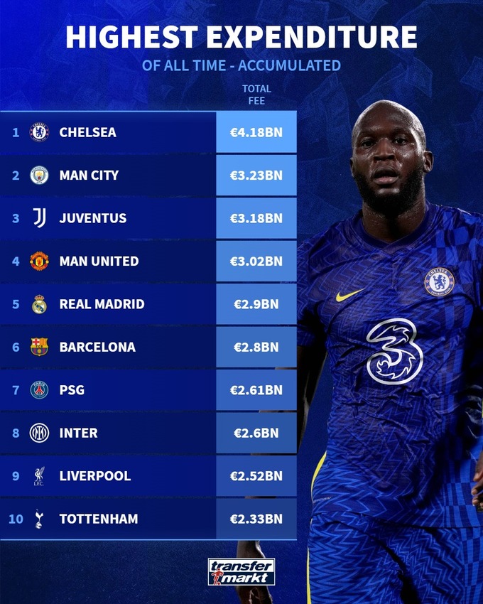 В топ-5 списка лидеров по потраченным средствам на игроков также вошли: «Манчестер Сити» (3,23 млрд), «Ювентус» (3,18 млрд), «Манчестер Юнайтед» (3,02 млрд) и мадридский «Реал» (2,9 млрд).