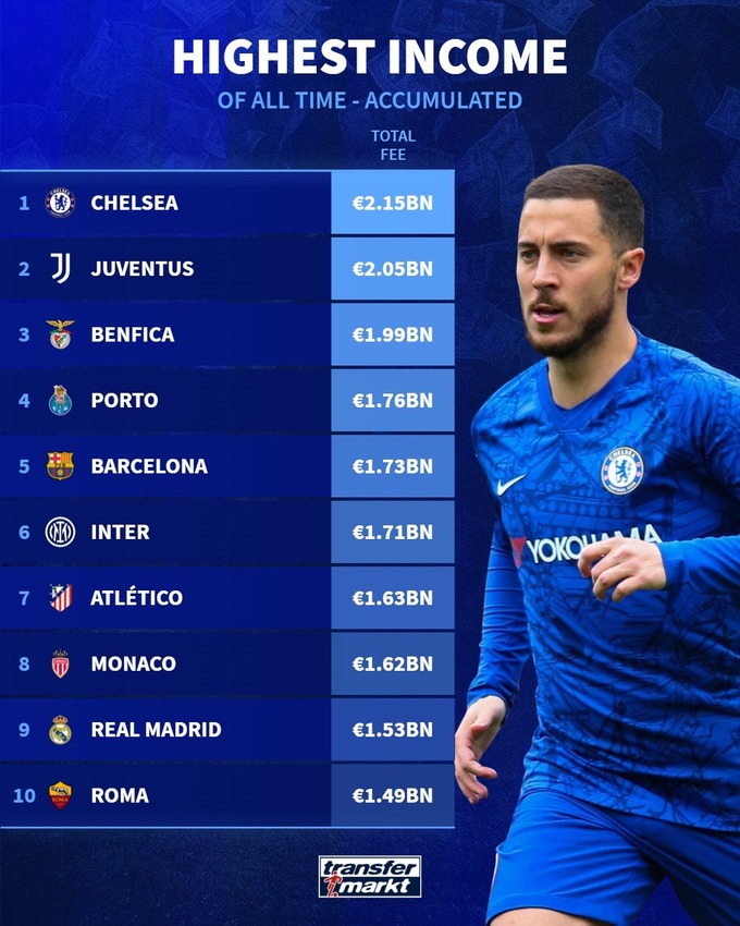Если же говорить о пятерке клубов, кроме «Челси», которые заработали больше всего на трансферах, то в нее входят: «Ювентус» (2,05 млрд), «Бенфика» (1,99 млрд), «Порту» (1,76 млрд) и «Барселона» (1,73 млрд).