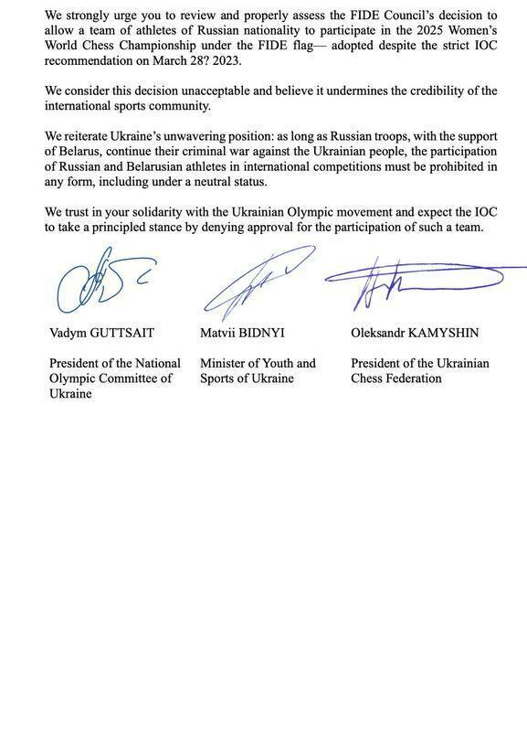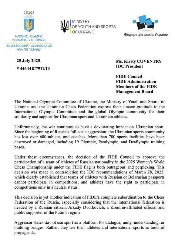 Министерство молодежи и спорта Украины, Национальный олимпийский комитет Украины и Федерация шахмат Украины обратились совместным письмом к руководству Международного олимпийского комитета и руководящим органам FIDE относительно обстоятельств одобрения участия команды спортсменок российской национальности в чемпионате мира по шахматам среди женщин 2025.