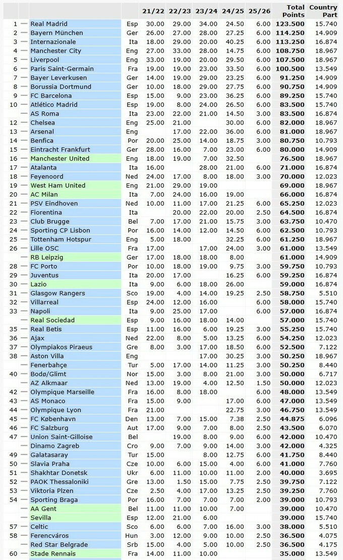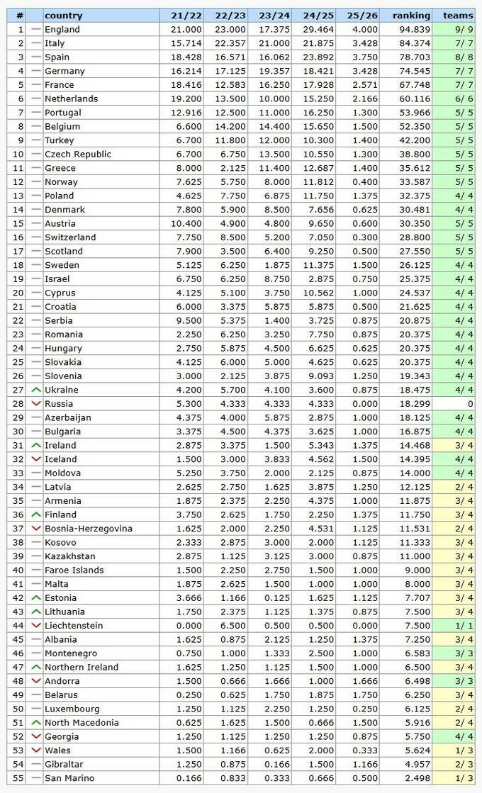 В рейтинге Украина поднялась на 27-е место (18.350), обогнав россию (18.299), у которой нет клубов в еврокубках из-за дисквалификации после начала большой войны, но ежесезонно начисляется минимально набранный коэффициент (4.333).