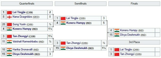В 1/2 финала было сыграно два китайско-индийских противостояния: Хампи Конеру (Индия) на тай-брейке переиграла Лей Тинцзе (Китай), а Дивья Дешмух (Индия) взяла верх над Тань Чжунъи (Китай).