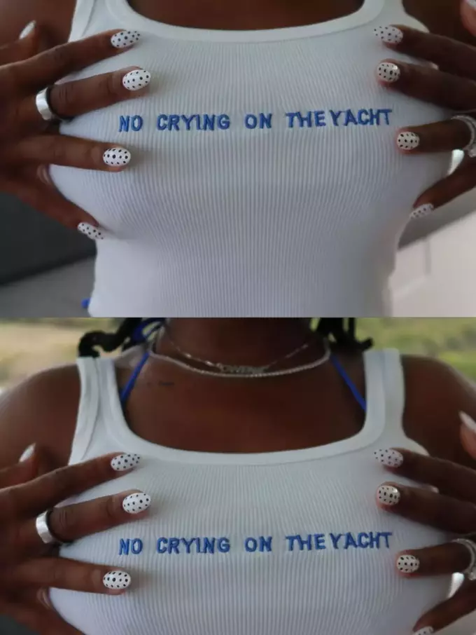 28-летняя семикратная олимпийская чемпионка выложила в Instagram яркие фото в синем купальнике и футболке с надписью «No crying on the yacht».