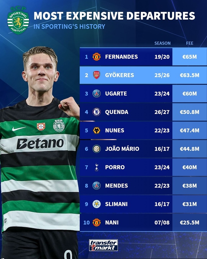 Предыдущая крупнейшая продажа клубом была осуществлена в сезоне 2019/20 – Бруну Фернандеш в «Манчестер Юнайтед» за 65 млн евро.