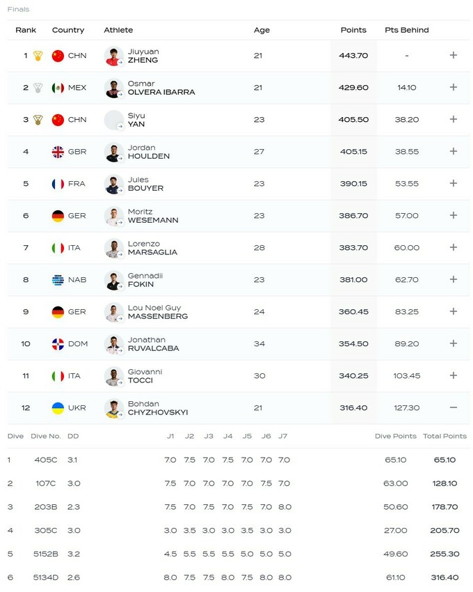 В соревнованиях на 1-метровом трамплине, которые прошли на ЧМ-2025 в Сингапуре, Чижовский завершил финал на 12-м месте.