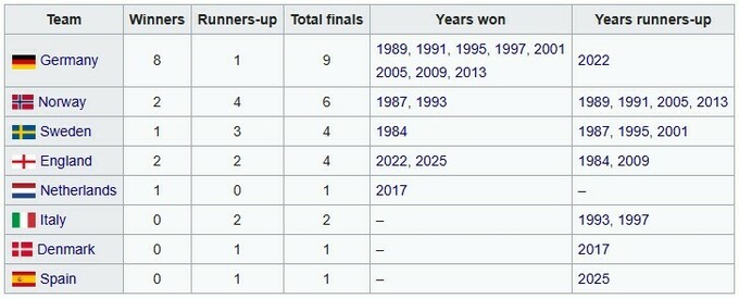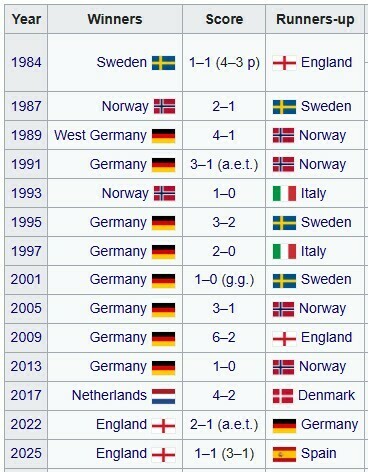 Второй трофей Англии подряд. Список финалов женских чемпионатов Европы