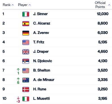 В топ-10 произошло несколько изменений благодаря трофея Алекса: де Минаур теперь является восьмой ракеткой мира. Австралиец выбил Андрея Рублева с первой десятки, опустив его на 11-е место. Бен Шелтон поднялся на 7-ю позицию, а Лоренцо Музетти потерял три строчки – он 10-й.