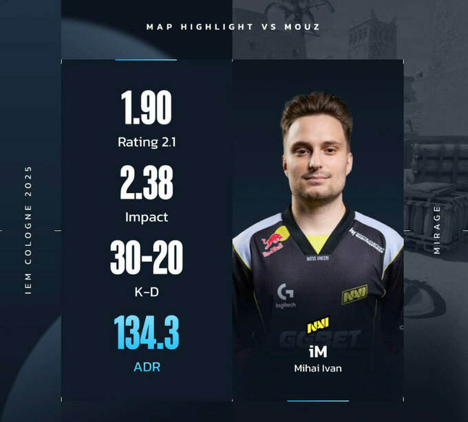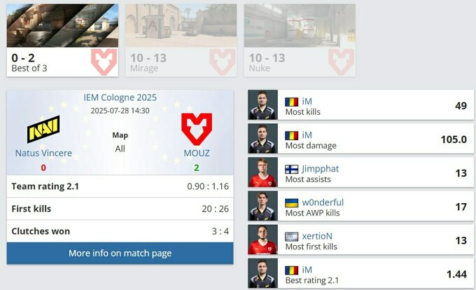 Европейский состав MOUZ уверенно одолел Natus Vincere в матче верхней сетки группы A на IEM Cologne 2025. Команда выиграла обе карты – Mirage (13:10) и Nuke (13:10), обеспечив себе выход в плей-офф турнира.