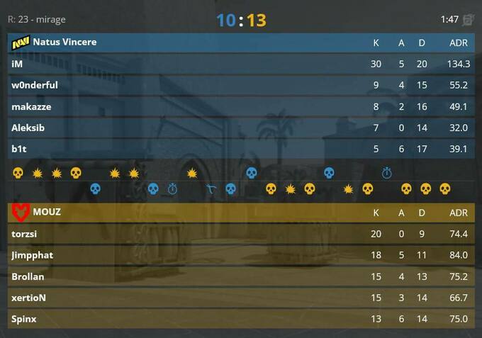 Серия началась с выбора NAVI – карты Mirage. Именно украинский клуб начал лучше: благодаря открывающим киллам Михая «iM» Ивана их атака выглядела уверенно. Однако MOUZ быстро пришли в себя – все игроки показали мультикиллы, что позволило сократить отставание до 5:7 перед сменой сторон.