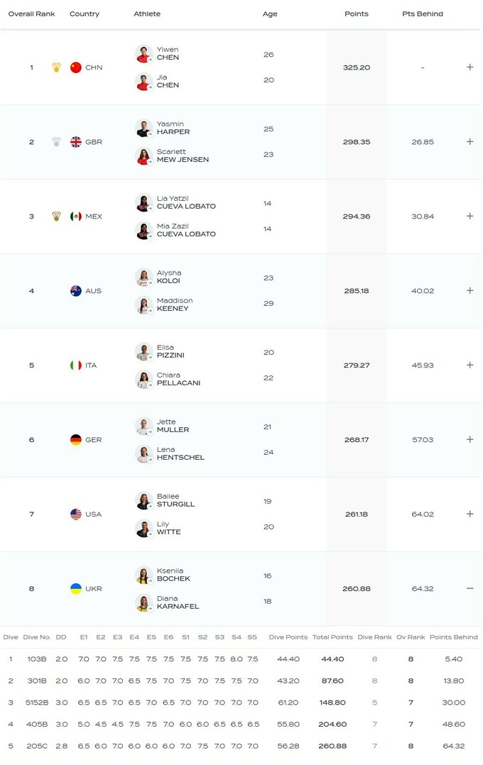 На чемпионате мира 2025 по водным видам спорта, который проходит в Сингапуре, состоялся финал в синхронных прыжках в воду с 3-метрового трамплина среди женщин.