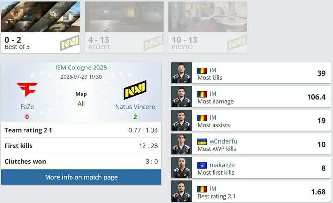 Natus Vincere во второй раз на этом турнире обыграли FaZe и вышли в плей-офф IEM Cologne. Матч завершился со счетом 2:0 (Ancient 13:4, Inferno 13:10). Европейский состав FaZe, в свою очередь, покинул турнир.