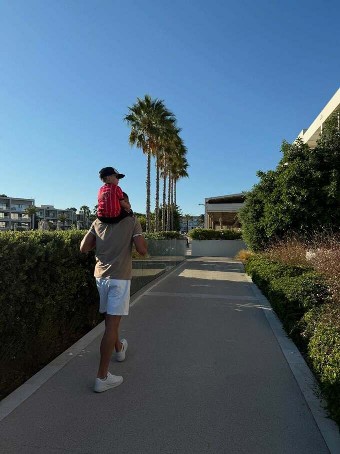 На другом кадре — трогательный момент: Андрей несёт сына на плечах среди пальм и закатного неба.