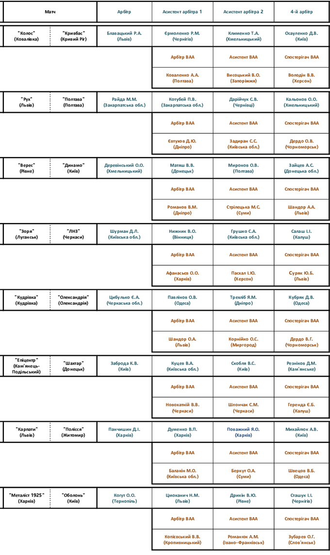 Определены судейские бригады на матчи 1-го тура Украинской Премьер-лиги 2025/26.