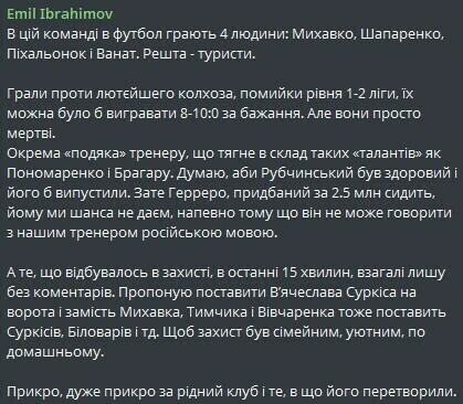 Emil Ibrahimov: В этой команде в футбол играют 4 человека: Михавко, Шапаренко, Пихалонок и Ванат. Остальные – туристы. Играли против лютейшего колхоза, помойки уровня 1-2 лиги, их можно было бы выигрывать 8-10:0 по желанию. Но они просто мертвые. Отдельная «благодарность» тренеру, что тянет в состав таких «талантов» как Пономаренко и Брагару. Думаю, если бы Рубчинский был здоров и его выпустили бы. Зато Герреро, приобретенный за 2.5 млн сидит, ему мы шанса не даем, наверное, потому что он не может говорить с нашим тренером на русском языке. А то, что происходило в защите, в последние 15 минут вообще оставлю без комментариев. Предлагаю поставить Вячеслава Суркиса на ворота и вместо Михавка, Тимчика и Вивчаренко тоже поставит Суркисов, Биловаров и тд. Чтобы защита была семейной, уютной, по домашнему. Досадно, очень досадно за родной клуб и то, во что его превратили.