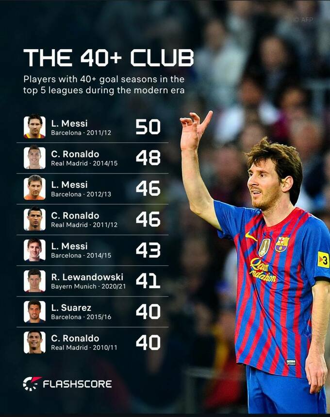 В этот список также вошли поляк Роберт Левандовски («Бавария» 2020/21 – 41) и уругваец Луис Суарес («Барселона» 2015/16 – 40).