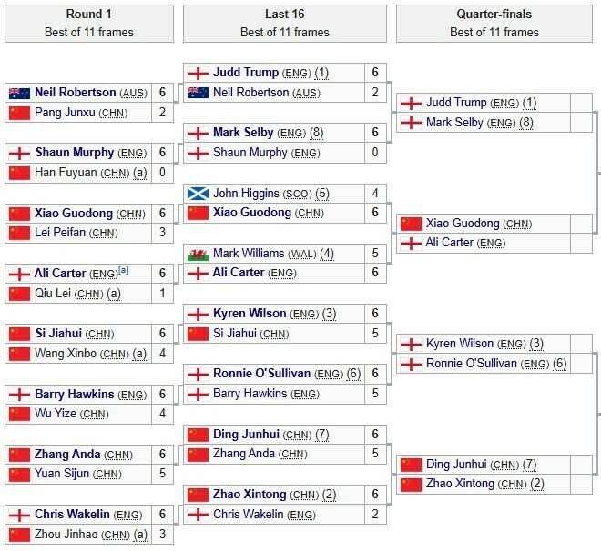 В 1/4 финала сыграют: Сяо Годун – Али Картер, Джадд Трамп – Марк Селби, Кайрен Уилсон – Ронни О'Салливан, Дин Цзюньхуэй – Чжао Синьтун.