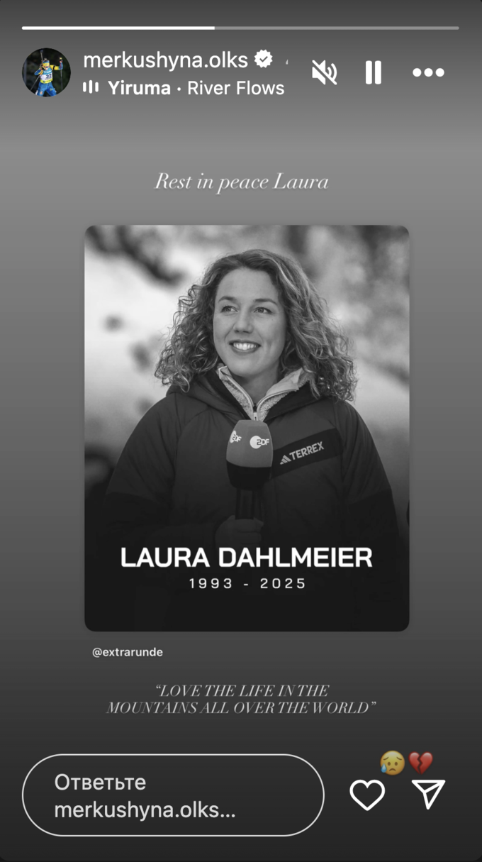 Украинская биатлонистка Олександра Меркушина выразила соболезнования по поводу смерти олимпийской чемпионки Лауры Дальмайер.