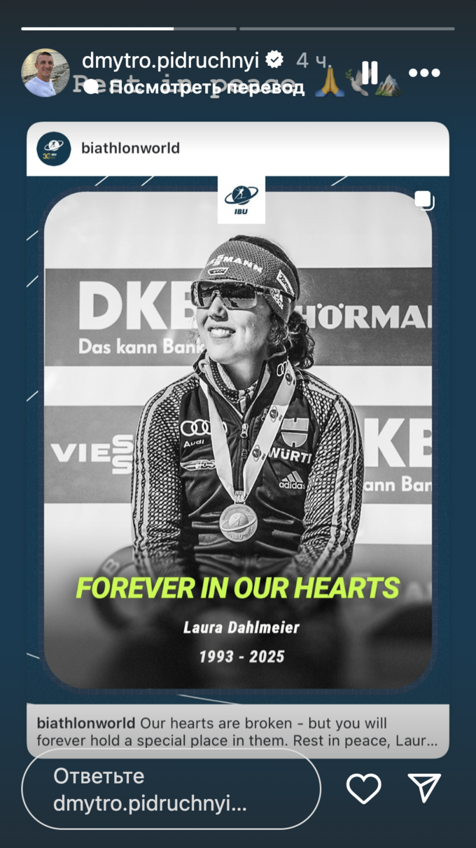 Чемпион мира с 2019 года по биатлону Дмитрий Пидручный высказался по поводу смерти олимпийской чемпионки Лауры Дальмайер.