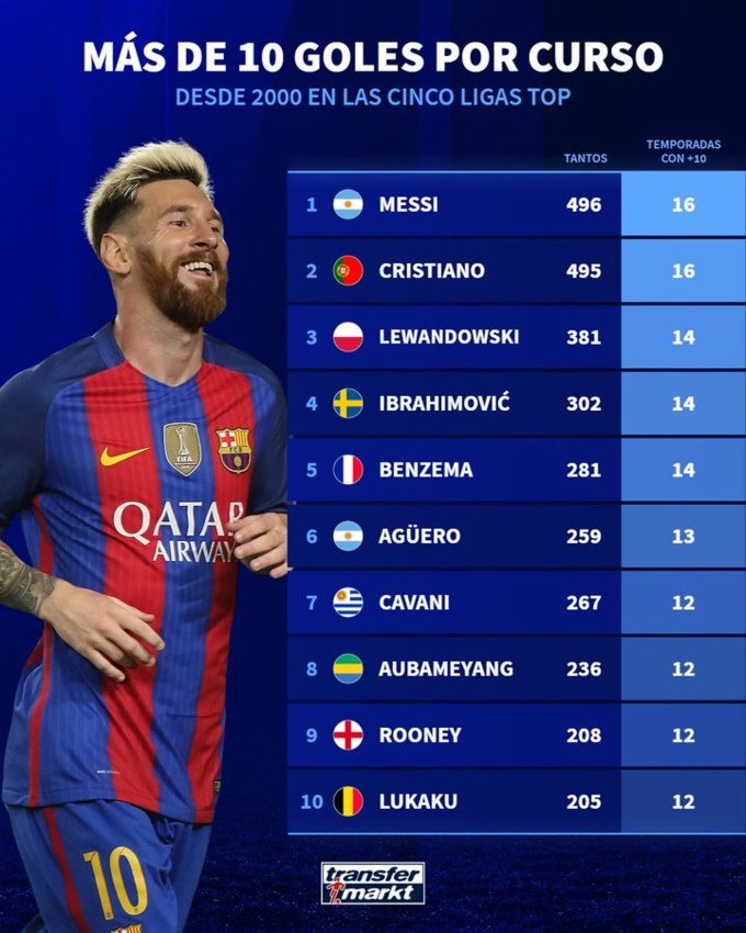 Рекордсменами оказались Лионель Месси и Криштиану Роналду, в активе которых по 16 подобных сезонов.
