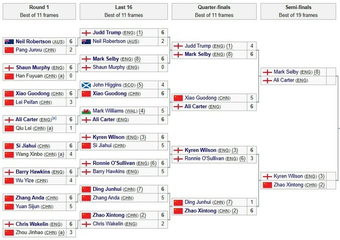 В 1/2 финала сыграют: Марк Селби – Али Картер, Кайрен Уилсон – Чжао Синьтун.
