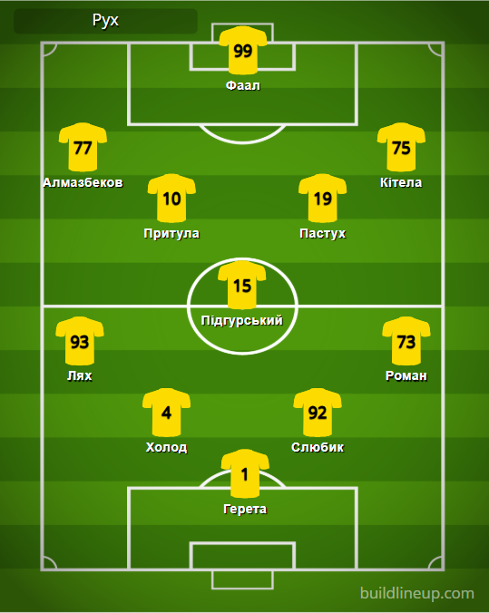 «Рух»: Герета – Лях, Холод, Слюбик, Роман – Притула (Слюсар, 90+3), Пидгурский, Пастух – Алмазбеков (Рунич, 75), Фаал, Китела (Клайвер, 63).