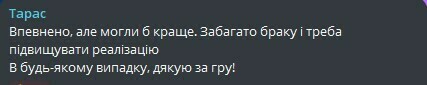 Тарас: Уверенно, но могли бы лучше. Слишком много брака и нужно повышать реализацию. В любом случае, спасибо за игру!