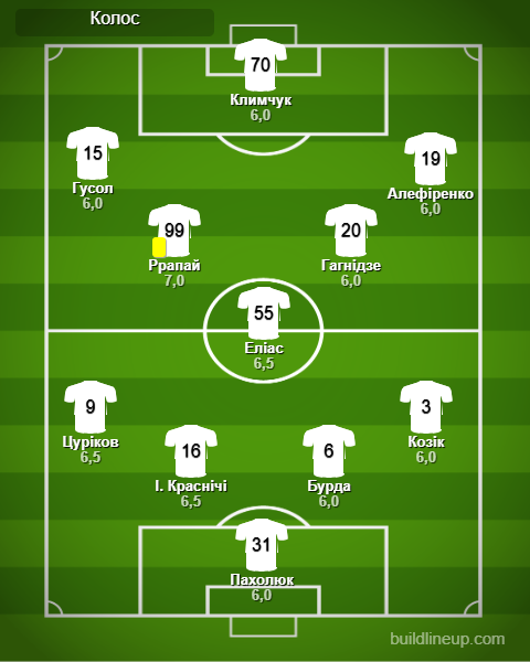 «Колос»: Пахолюк – Цуриков, И. Красничи, Бурда (Понедельник, 38), Козик – Элиас – Гусол (Велетень, 62), Ррапай (А. Красничи, 76), Гагнидзе, Алефиренко (Кане, 62) – Климчук (Третьяков, 76)