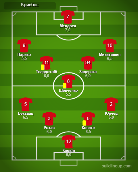 «Кривбасс»: Кемкин – Бекавац, Рохас (Виливальд, 66), Конате, Юрчец – Шевченко (Бандейра, 46) – Парако (Лин, 66), Твердохлёб, Задерака (Каменский, 80), Микитишин (Илич, 80) – Мендоса
