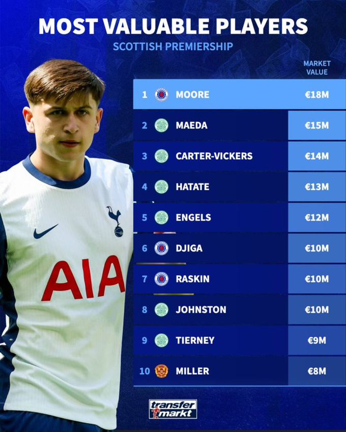 После перехода на правах аренды в «Рейнджерс» английский нападающий «Тоттенхэма» Майки Мур стал самым дорогим игроком чемпионата Шотландии (18 миллионов евро).