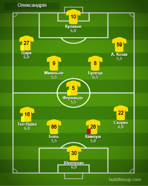 «Александрия»: Шевченко – Тео Ндика, Боль, Кампуш, Скорко – Фернандо Энрике (Ковалец, 46) – Цара (Жота, 79), Мишнёв (Шостак, 72), Булеца, Ар. Козак (Безерра, 46) – Кулаков (Туати, 72)