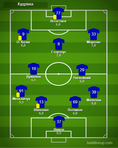 «Кудровка»: Яшков – Мельничук, Шаповал, Поиімков, Мачелюк – Думанюк, Нагнойный (Матвеев, 90+3) – Ал. Козак (Свитюха, 82), Морозко (Коркишко, 82), Сторчоус (Тотовицкий, 68) – Легостаев (Безбородько, 82)