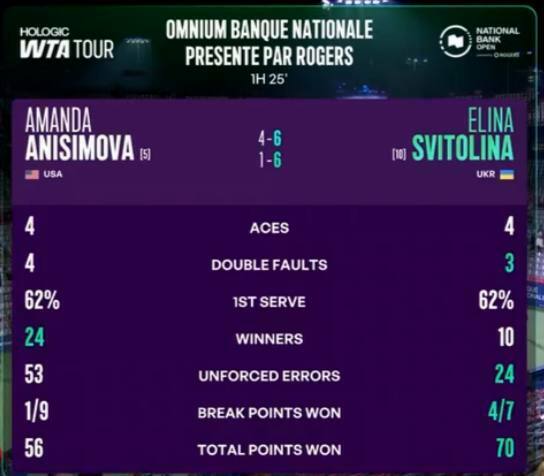 Элина в двух сетах переиграла Аманду Анисимову в четвертом круге турнира в Канаде