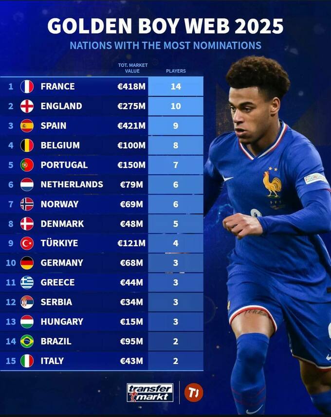 На второй и третьей позициях расположились Англия и Испания, которые имеют по 10 и 9 представителей соответственно. Интересно отметить, что испанцы имеют наибольшую общую сумму в рейтинге – 421 млн. Один испанский нападающий «Барселоны» Ламин Ямаль, который является лидером списка самых дорогих номинантов, стоит 200 млн евро.