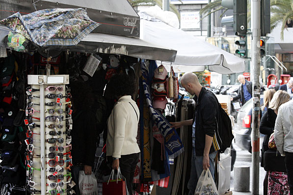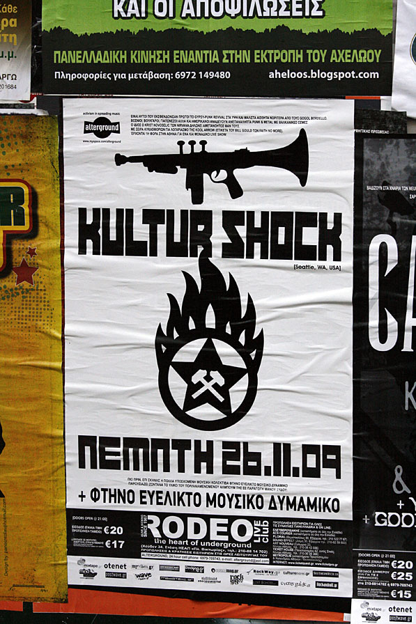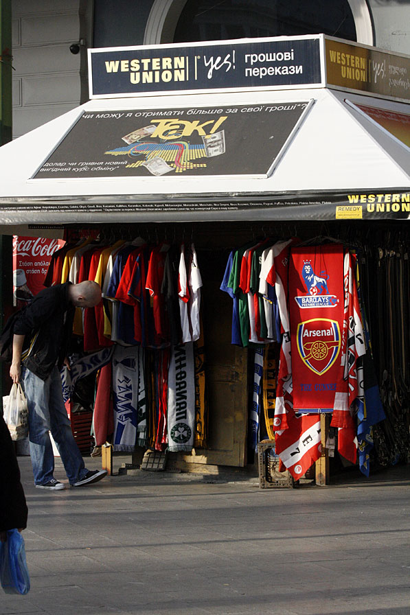 На этом кадре удивляют 2 вещи: на фоне всей продаваемой атрибутики на первый план выставлена атрибутика лондонского Арсенала, а на крыше ларька - реклама на украинском языке! И это в центре Афин!