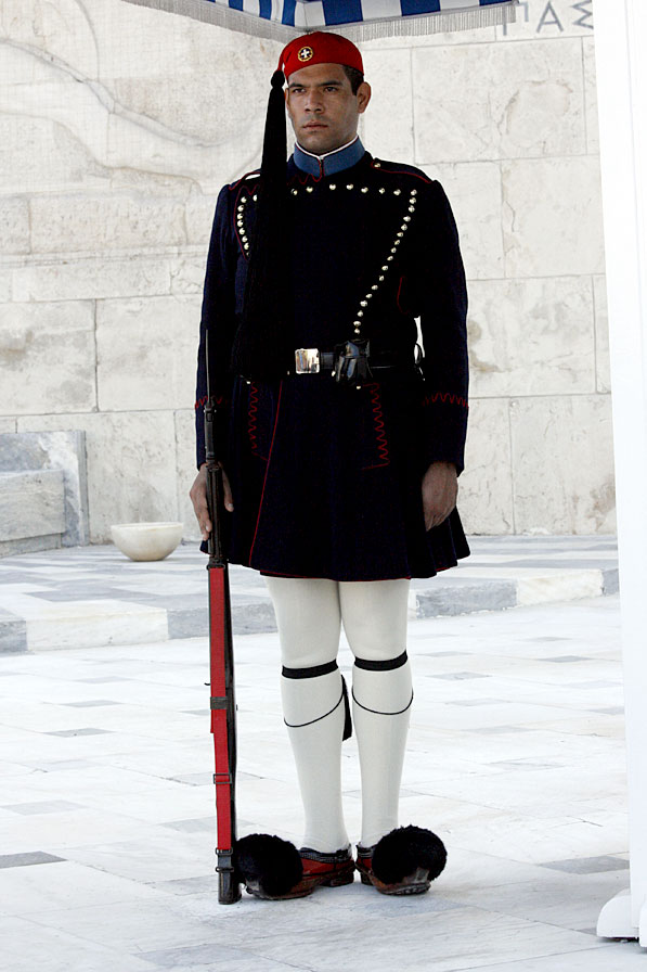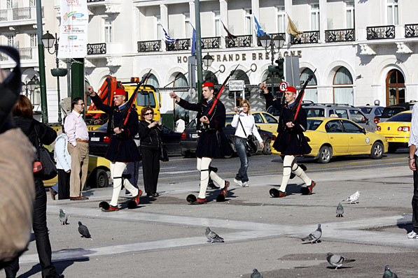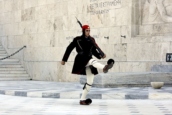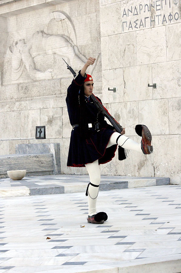 Смена караула президентской гвардии - самая живая диковинка Афин. Так пишут туристические сайты. На самом же деле данная процедура больше похожа на некую, уж извините, клоунаду и цирк. Гвардейцы исполняют такое, что не упасть со смеху достаточно сложно. А когда узнаешь, что их ботинки с металлическими подковами для пущей громкости шага весят 5 кг и что одеты гвардейцы в двойные шерстяные чулки (и это при неимоверной жаре даже в ноябре!), и вовсе остается только диву даваться. Выдержать такое не просто, потому гвардейцы находятся на своем посту только 1 час.