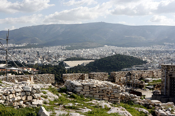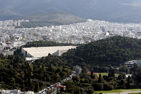 Рядом со стадионом открывается отличный вид на афинский Акрополь. Акрополь - это защитное крепостное сооружение на вершине холма/горы или другими словами - убежище на время войны. На вершине афинского Акрополя расположен храм Парфенон.
