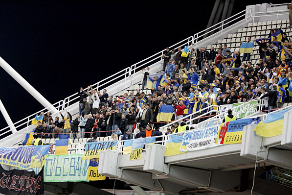 Украинские болельщики были на отдельном секторе. Хотя была и еще одна группа - на одном из центральных секторов в перемешку с греками. Но к середине первого тайма группу наших фанов окружили стюарды и полиция. Даже показалось, что там была некая заворушка.