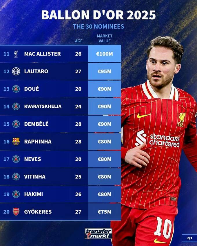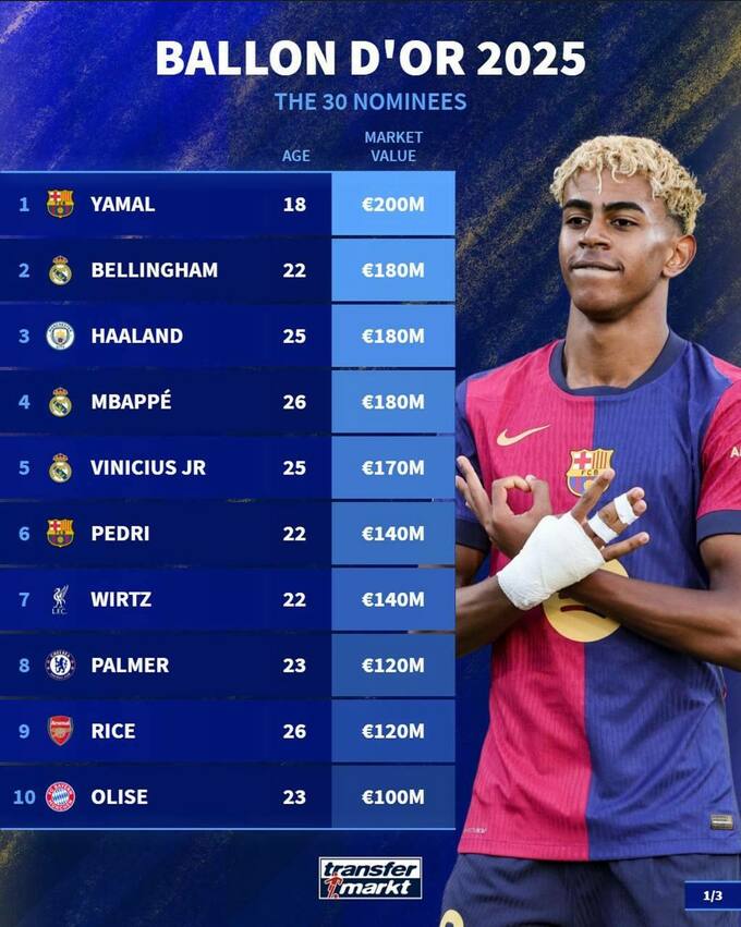 Недавно France Football объявил 30 претендентов на награду «Золотой мяч». По этому случаю портал Transfermarkt опубликовал рейтинг этих игроков по их текущей рыночной стоимости. Лидером списка стал 18-летний испанский нападающий «Барселоны» Ламин Ямаль – 200 миллионов евро.