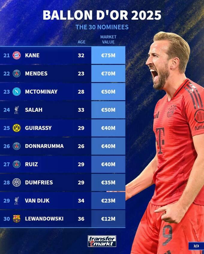 Самым дешевым претендентом на «Золотой мяч» является 36-летний польский нападающий «Барселоны» Роберт Левандовски – 12 млн.