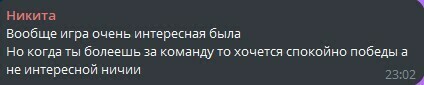 Никита: Вообще игра очень интересная была. Но когда ты болеешь за команду то хочется спокойно победы а не интересной ничьей.