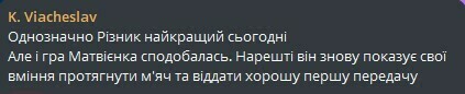 K. Viacheslav: Однозначно, Ризнык лучший сегодня. Но и игра Матвиенко понравилась. Наконец, он снова показывает свои умения протянуть мяч и отдать хорошую первую передачу.