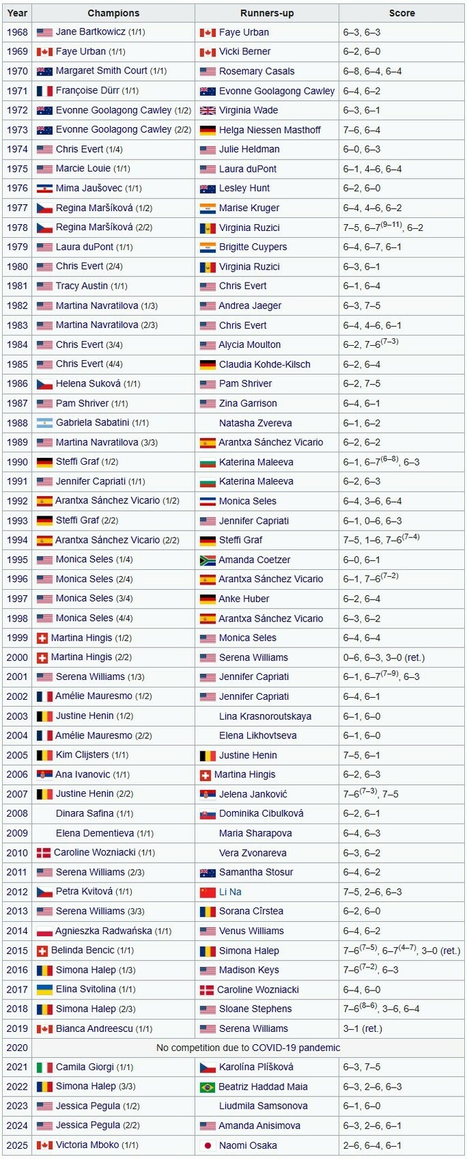 Историческая таблица. Все финалы женского Canadian Open в Открытой эре