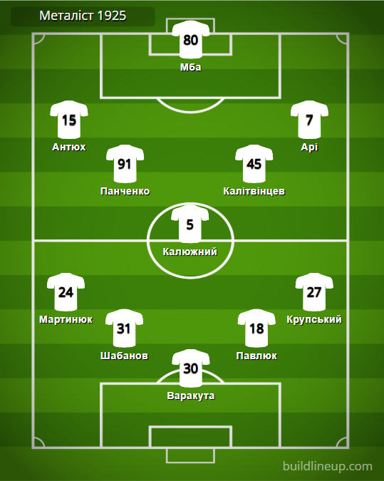 «Металлист 1925»: Варакута – Мартынюк, Шабанов, Павлюк, Крупский – Панченко (Чурко, 71), Калюжный, Калитвинцев (Когут, 71) – Антюх, Мба (Петер, 57), Ари (Рашица, 57).
