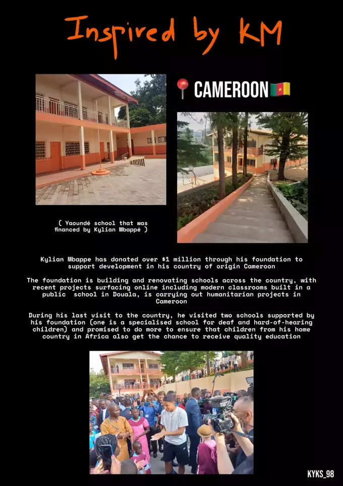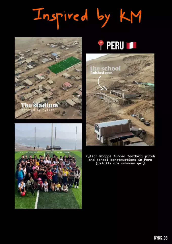 ❗️Through his foundation named Inspired by KM, Kylian Mbappé has built a school and a football pitch in Peru, a school in Cameroon and a football pitch in Algeria. pic.twitter.com/8CsIWDgN5F