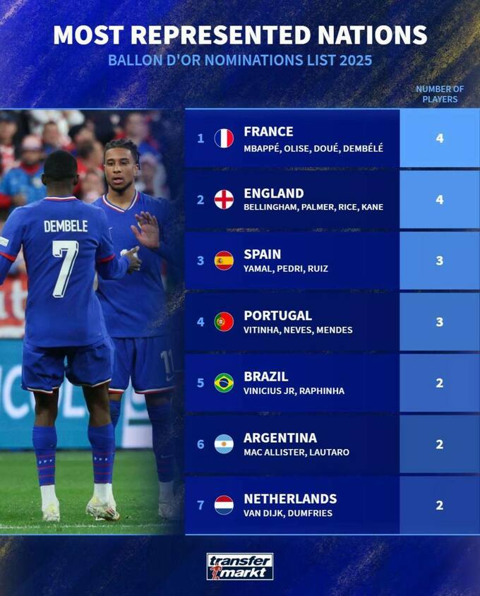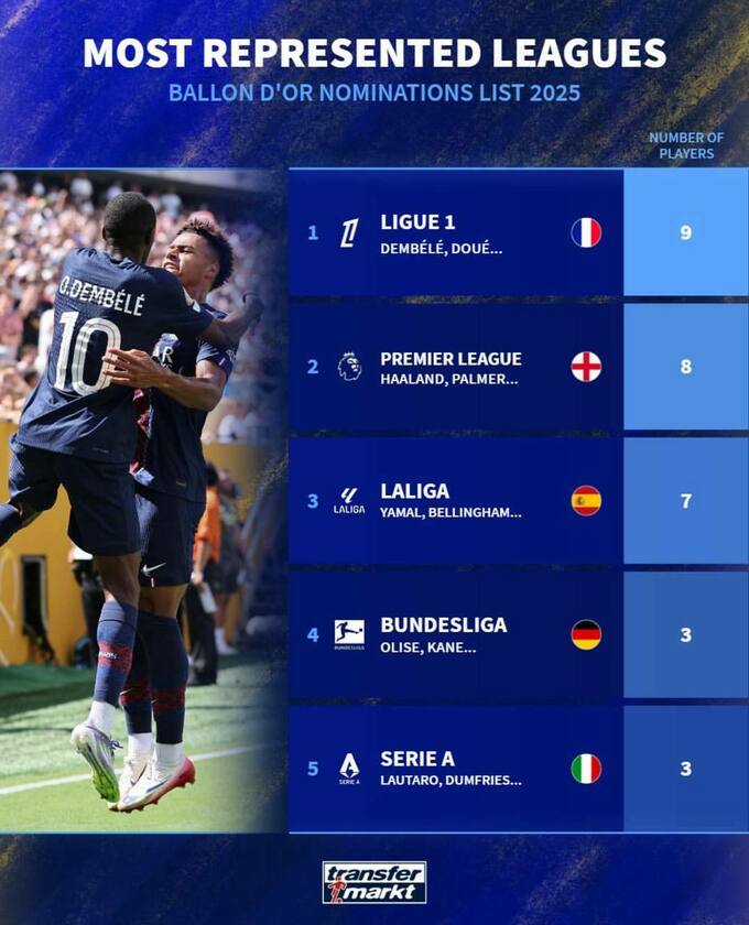 Среди чемпионатов лидером является Лига 1, у которой также 9 игроков (все они выступают за «ПСЖ»). Ближайшим преследователем стала Английская Премьер-лига с 8 номинантами.