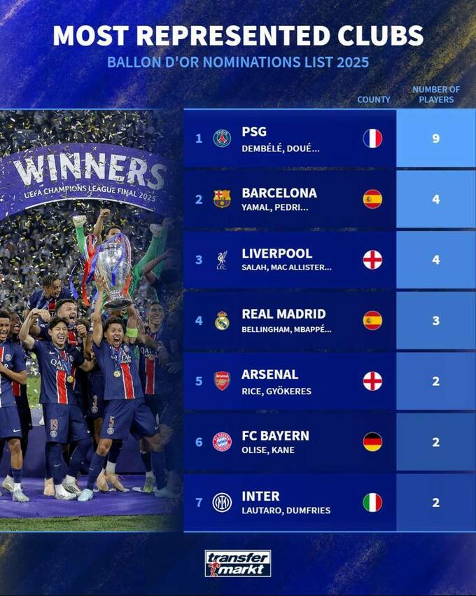 Если распределить претендентов по клубам, то больше всего игроков в списке имеет «ПСЖ» – 9. На втором месте расположились сразу две команды: «Барселона» и «Ливерпуль», у которых по 4 представителя.