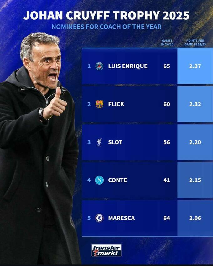 Недавно France Football объявил пятерку претендентов на трофей Йохана Кройфа (лучший тренер года). Этими кандидатами стали наставники: «ПСЖ» Луис Энрике, «Барселоны» Ханси Флик, «Ливерпуля» Арне Слот, «Наполи» Антонио Конте и «Челси» Энцо Мареска.