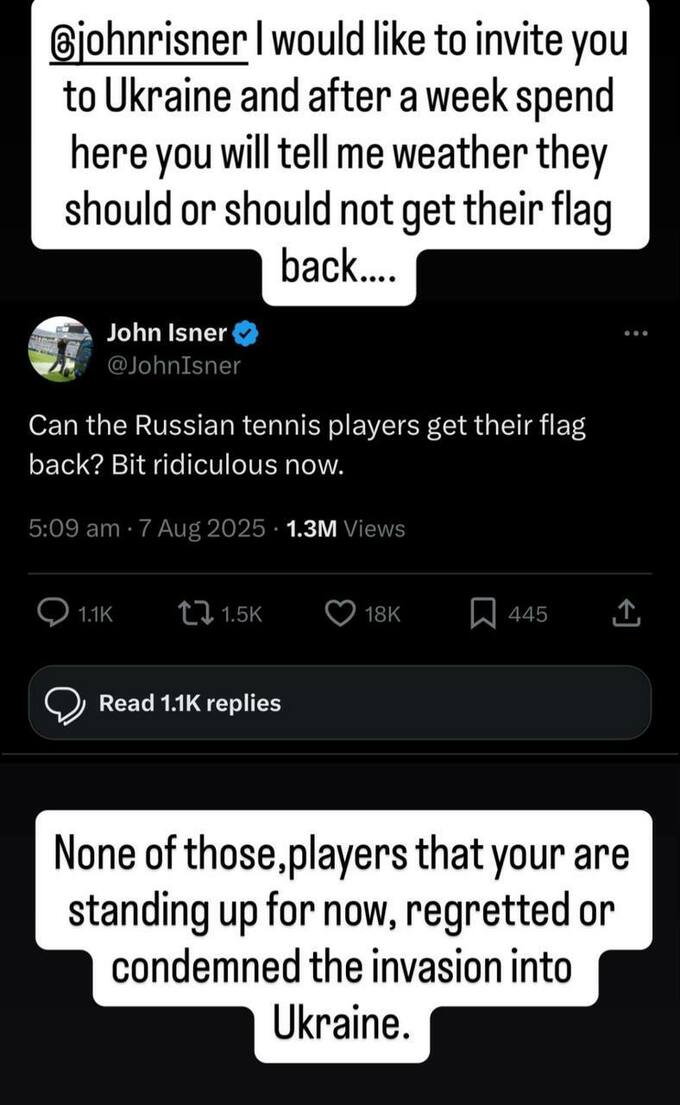 Украинский экс-теннисист, финалист юниорского US Open 2004, мастер-сержант спецподразделения СБУ «Альфа» Сергей Стаховский отреагировал на слова бывшего восьмого номера рейтинга АТР Джона Изнера, который предложил вернуть россиянам флаг: