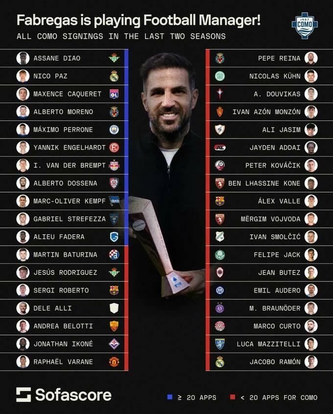Главный тренер «Комо» Сеск Фабрегас за последние два сезона подписал в клуб 36 игроков.