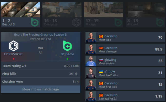 Украинец Александр «s1mple» Костылев в составе BC.GAME выиграл первый матч в рамках тир-3 турнира The Proving Grounds Season 3. Им удалось переиграть россиян cybershoke со счетом 2:1 по картам.